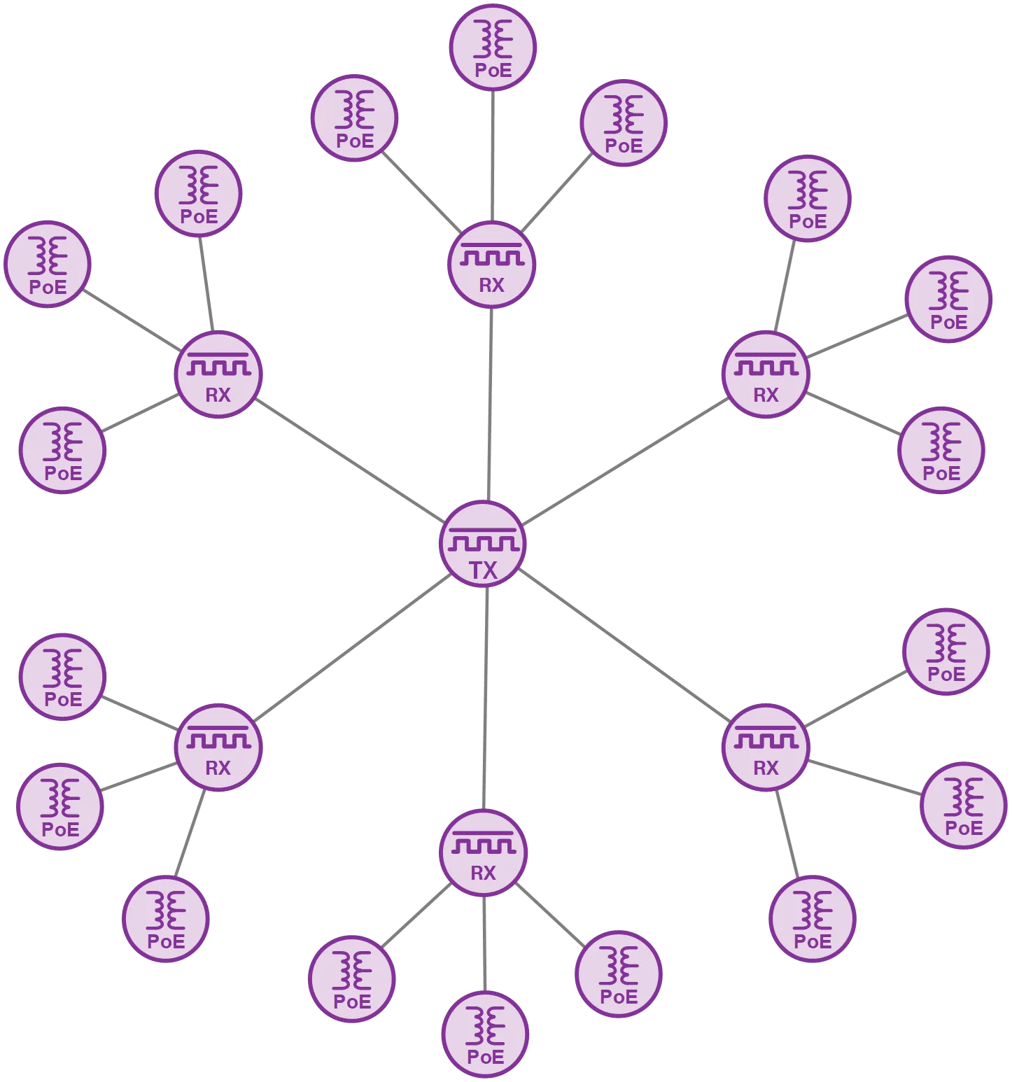 Anstatt kleine Energiemengen auf viele Endpunkte zu verteilen, bringt die Sterntopologie für die Stromversorgung echte elektrische Kapazitäten in die Netzwerkinfrastruktur selbst. Es liefert Energie in großem Umfang und nutzt dabei die gleichen Kabel, die bereits für die Netzwerkverkabelung vorhanden sind.